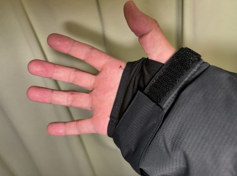 袖口は、二重袖(インナーカフス)になっていて、手首から入る冷たい風をしっかりシャットアウトしてくれます。この二重構造があるかないかで、暖かさは全然違いますよね。手の甲までしっかり守られて、ぬくぬくです。