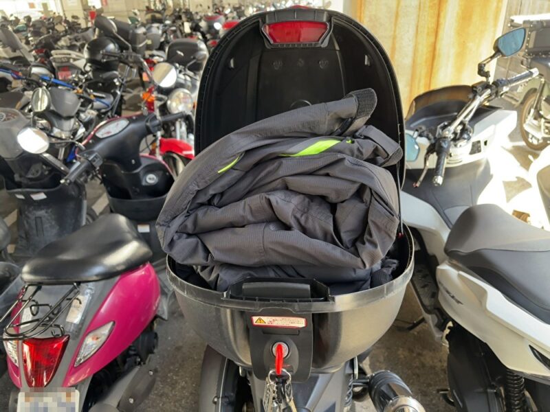 それは、折りたたんだ時の厚みです。リヤボックスに入れてみると、ご覧の通り、この防水防寒スーツだけでボックスがほぼ埋まってしまいました。
