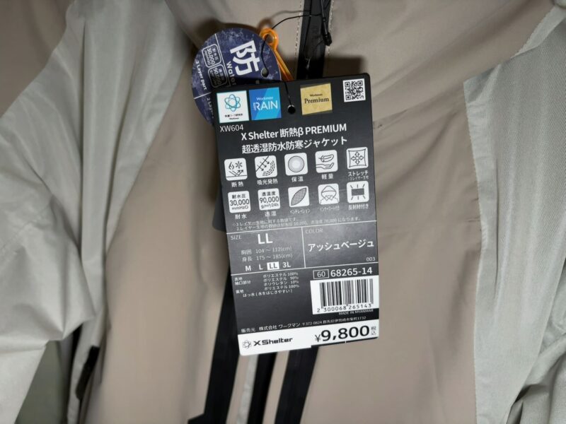 まずはタグと外観をチェック。 お値段は上着のみで9,800円(税込)。ワークマンの中では高級路線ですが、一般のアパレルブランドなら3万円以上してもおかしくないスペックです。