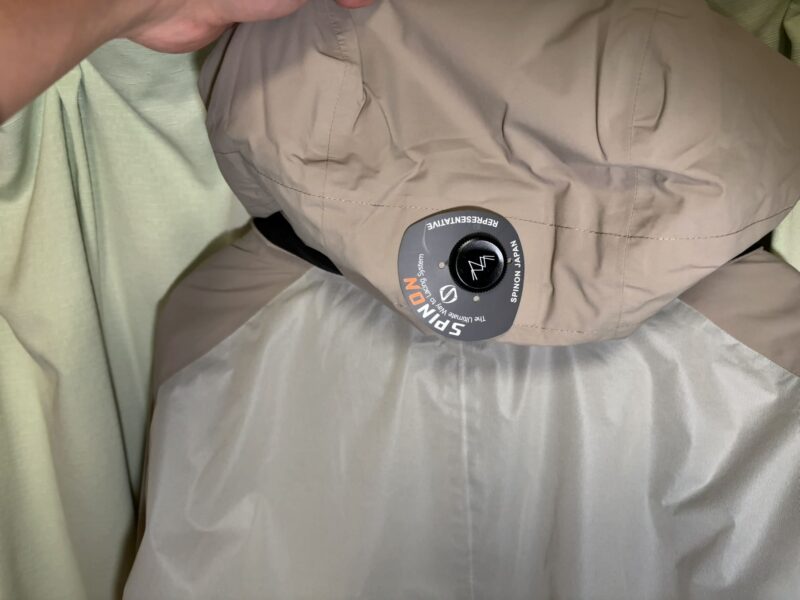 フロントファスナーの下には謎の「一か所だけボタン」が。これ、ファスナーを開けたままでもバタつかずに風を通せる仕組みですね。