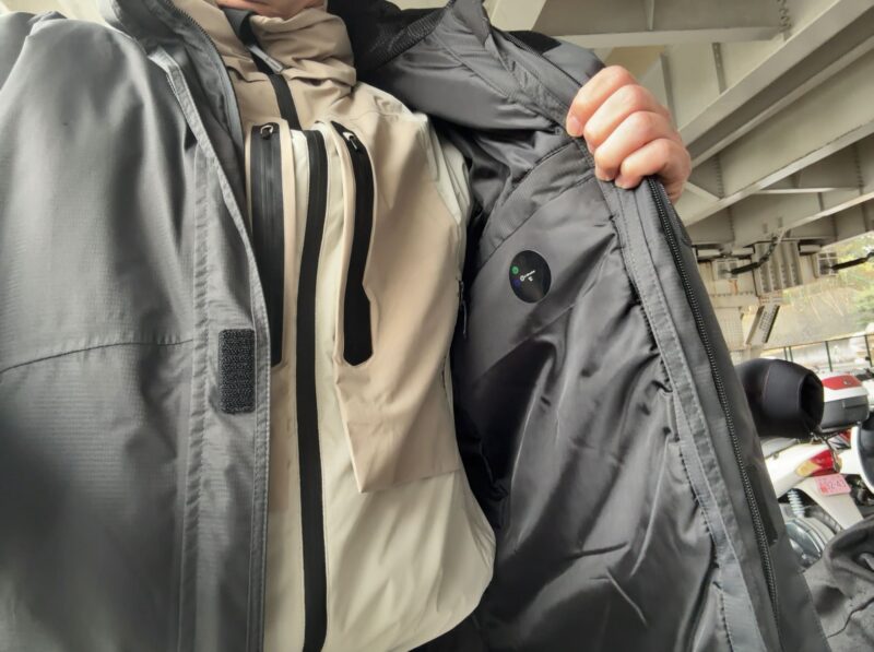 走行中のサーモメーターは、大体26℃をキープ。 走行風で少し表面が冷えても、内側の暖かさが逃げない「断熱」の実力をしっかり体感できました。駐輪場に停めた後は、外側のαを脱いで、βのまま駅まで歩きましたが、10万g近い透湿度のおかげで、歩いても全く蒸れません。