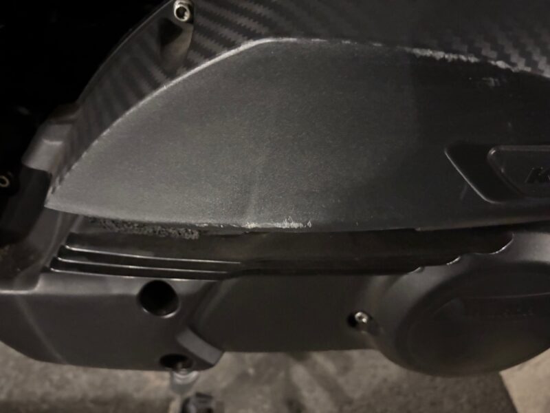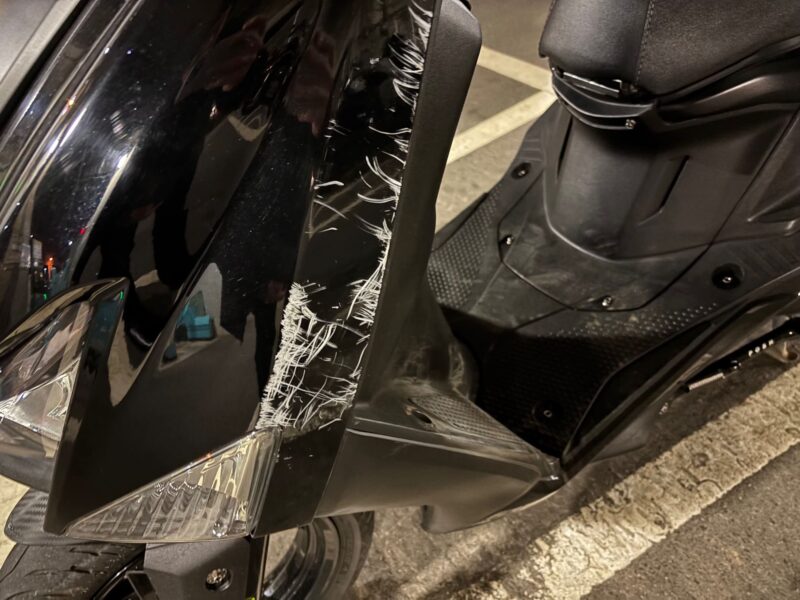 通勤車として、場所によってはキツキツの駐輪場では、少々の小傷はやむを得ないと考えます。でも、この広範囲のダメージを黙って放置して逃げられたのは、さすがにメンタルがヘコみます。