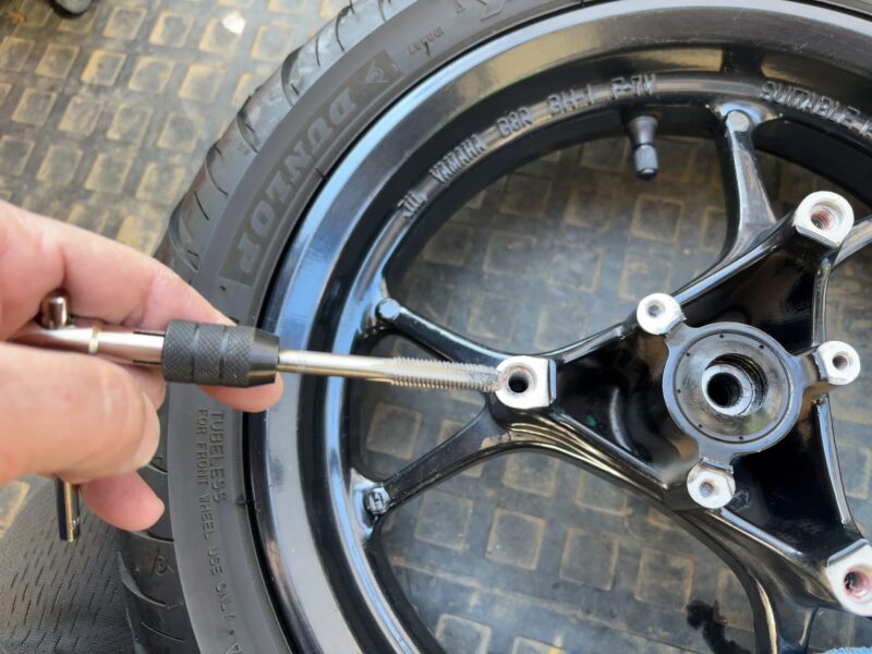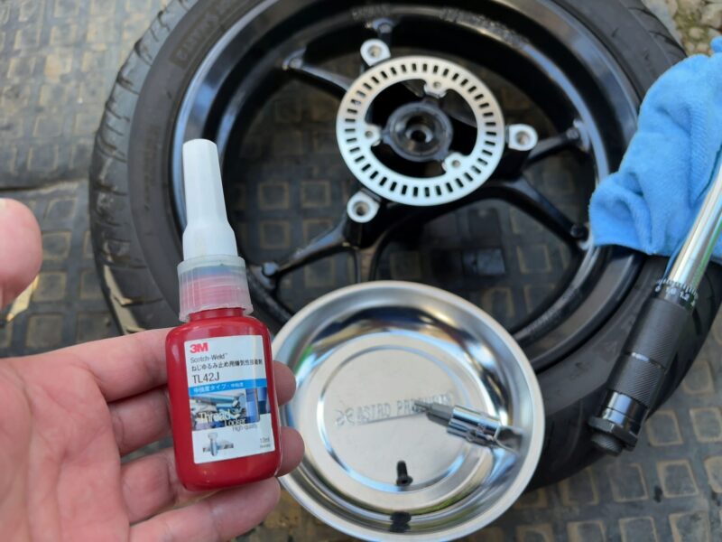 ちょっと見えにくいですが、カスとネジロック剤がこびりついてますね。ディスクローター側もセンサー側もしっかりおこないました。このひと手間で、新しいボルトがスルスル入ります。