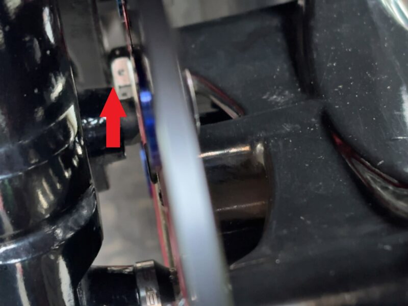 ちょっと見ずらいですが、赤い矢印の先、ボルトの頭とキャリパーサポートのクリアランスが……極狭です!