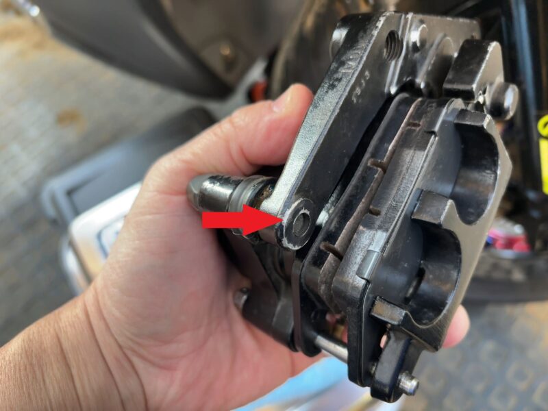 このままでは干渉の恐れがあったため、キャリパーを一度外し、サポート側をヤスリで少しだけ削って対策しました。